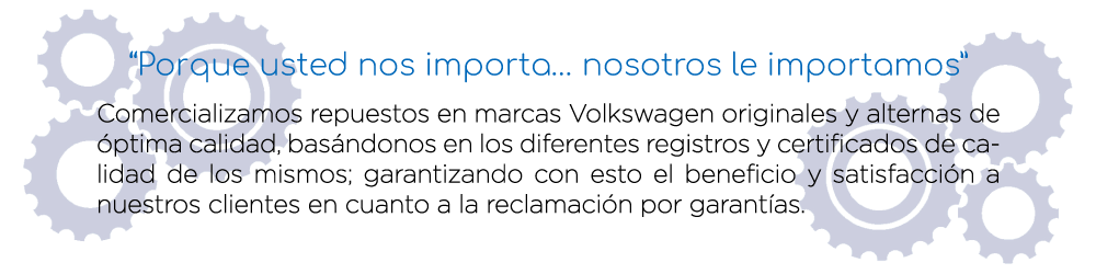 Somos importadores directos y comercializadores a nivel nacional de repuestos nuevos automotores para la marca Volkswagen en sus líneas de automóviles, Vans pasajeros y pick ups.